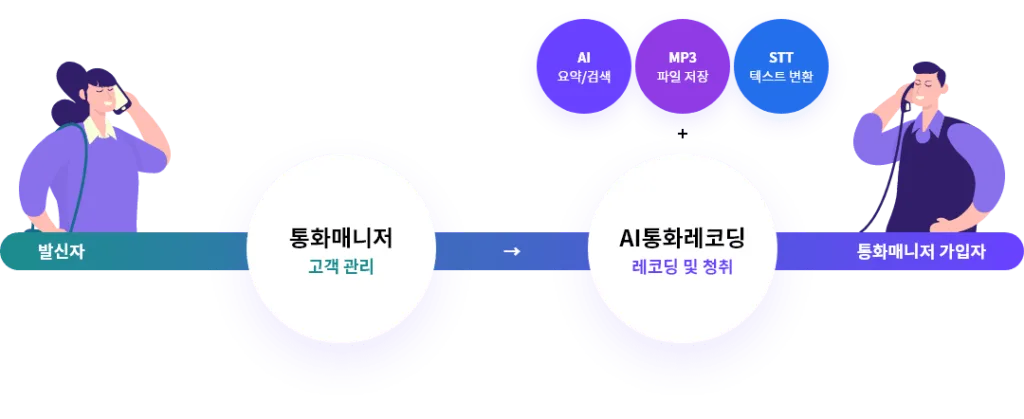 AI 기술로 통화 녹취, 요약, 검색, 민원 분쟁 및 폭언 예방, 비용 등 효율적인 고객관리가 가능합니다.